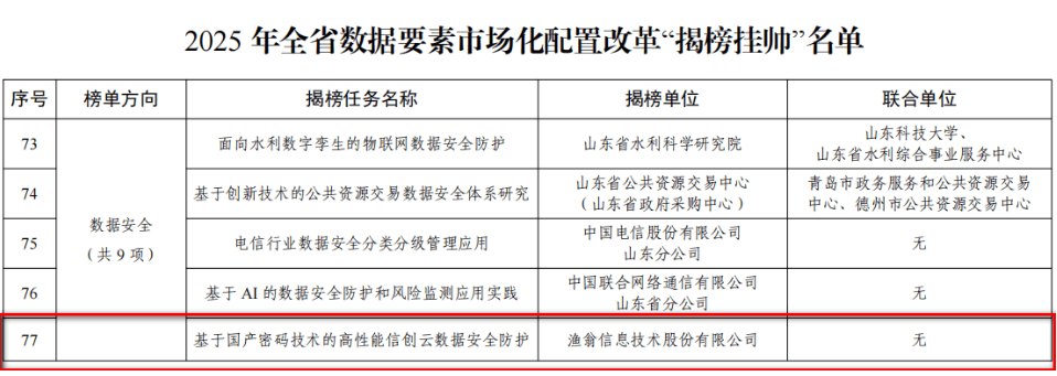 近期,山东省大数据局公布了《2025年全省数据要素市场化配置改革“揭榜挂帅”名单》。凯发k8官网信息独立申报的“基于国产密码技术的高性能信创云数据安全防护”项目,凭借在数据安全与要素流通领域的技术创新与实践成果,从众多单位中脱颖而出,成功入选。凯发k8官网信息成为揭榜单位中唯一的商密企业。